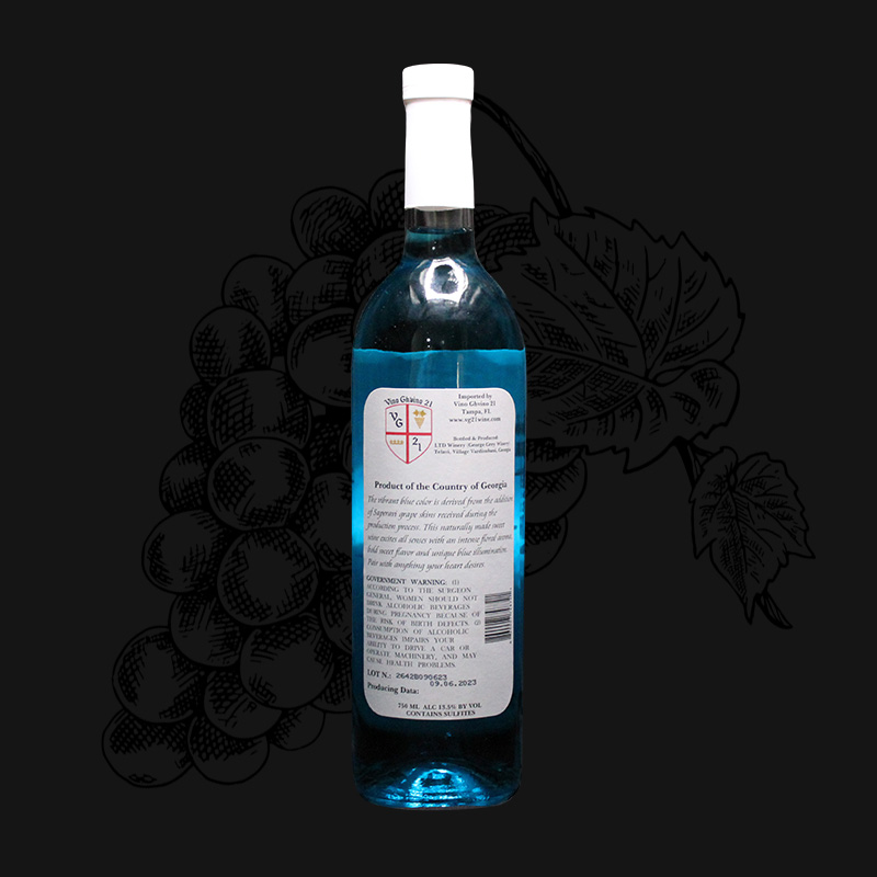 The vibrant blue color is derived from the addition of Sapervavi grape skins received during the production process. This naturally made sweet wine excites all senses with an intense floral aroma, bold sweet flavor and unique blue illumination. Pair with anything your heart desires.